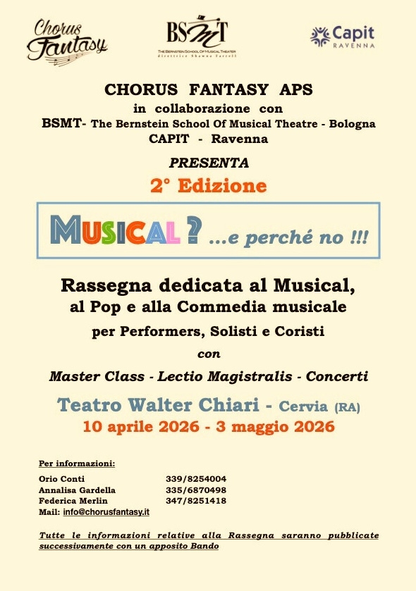 E' in preparazione la 2° Edizione della Rassegna "MUSICAL?...e perchè no!!!", Rassegna dedicata al mondo del Musical, del Pop e della Commedia Musicale: comprenderà Master Class, Lectio Magistralis e Concerti e sarà rivolta a Performers, Solisti e Coristi.