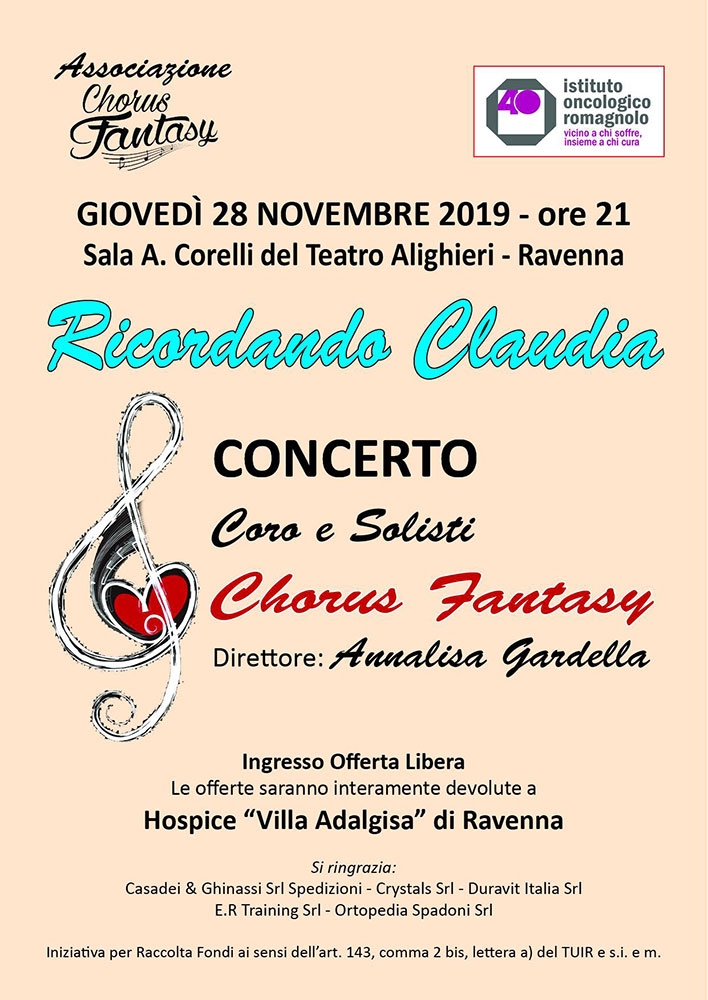 Il coro Chorus Fantasy sarà protagonista, giovedì 28 novembre, alle ore 21, alla Sala Corelli del Teatro Alighieri di Ravenna, del concerto “Ricordando Claudia”. Un viaggio musicale attraverso il repertorio della formazione ravennate, dal musical al rock, dedicato ad una persona speciale che del coro ha fatto parte, Claudia Baccanelli.